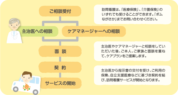 訪問看護サービスのご利用には主治医の指示書が必要です。まずはご利用者さまの症状を最も理解されている、かかりつけのお医者さんとご相談ください。